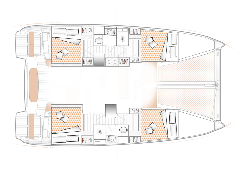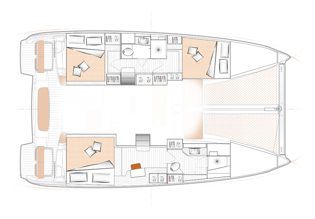 Compared to traditional cruising catamarans, the Excess 11 has a lighter displacement, lower boom, and more performance-oriented sail plan. These features improve speed, responsiveness, and sailing feel while maintaining essential cruising amenities.