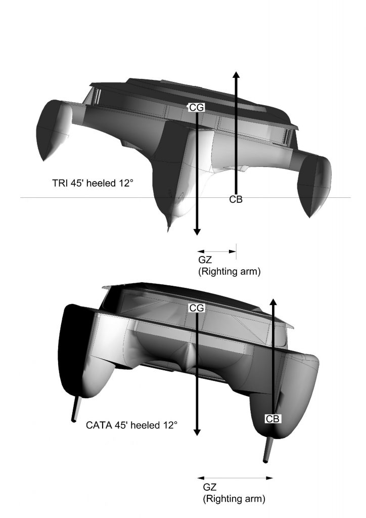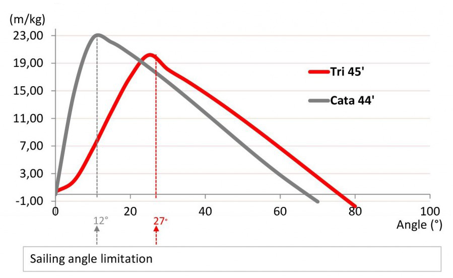 At the same 12° of heel—a catamaran’s safety limit—the catamaran develops double the righting moment (GZ) of a trimaran.
